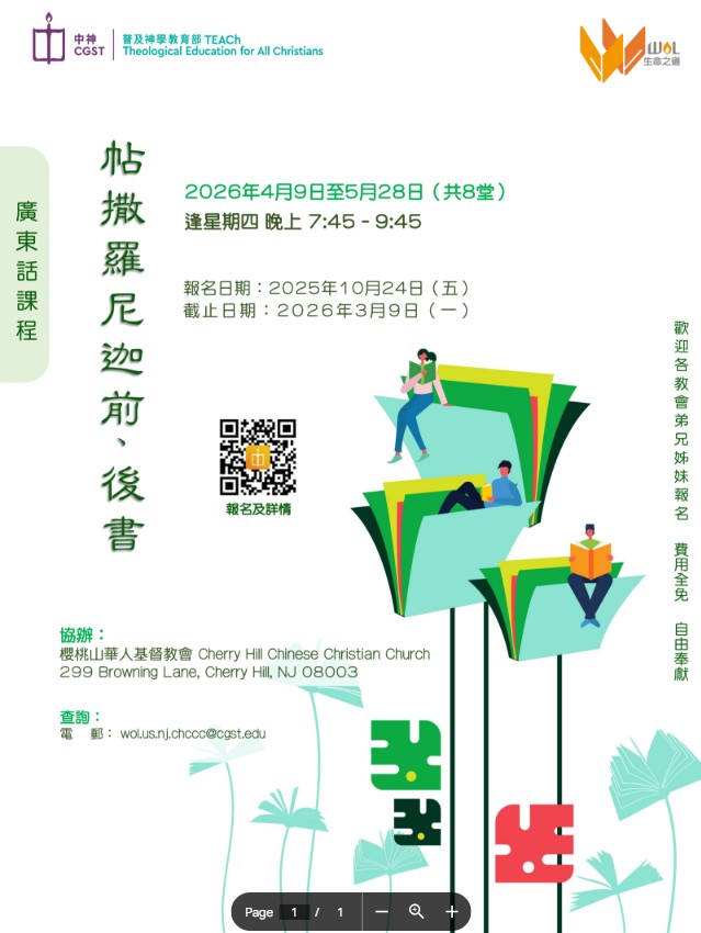 为加强本地宣教事工,教会组织宣教小组,定期到周边社区发放宣传单张,请有负担并愿意参加的兄弟姐妹们与涂汉明弟兄联系。青少年和同工們計劃在主日 2 月 22 日下午 1:30至2:30前往Echelon 養老院探訪華裔長者,並陪伴他們一起慶祝春節。我們會用歌聲、音樂和輕鬆幽默的笑話與他們同樂,並以中文呈現整個節目。這將是一個非常寶貴的機會,讓我們能夠向長者們見證並分享耶穌基督的愛,把溫暖與祝福帶給他們。如果您有興趣幫忙或參加,請聯繫雪梅姐妹(609-636-8363)或 Phil弟兄(856-520-9259)。教會將組建差傳委員會,開展宣教外展事工,包括派發福音單張、爲耶穌舉牌等行動。誠邀弟兄姐妹實際參與宣教事工的籌備、禱告與執行,同心配搭、彼此服事,見證主的名。有意參與者,請聯繫陳牧師或宣教執事(漢明弟兄)。自1月份開始,主日學時間(11:30 am), 陳牧師開始帶領“門徒培訓”, 地点在主堂。 爲去年底會員大會順利選出合神心意的執事們感謝神,請爲執事們甘心樂意的事奉禱告。2026年的执事事工分配如下:主席/总务:吴冀川;关怀/迎新: 杨冰白;财务/文书:滕靖;青少年/英文:刘彦金;团契/教育:李安雄;儿童:曾可丰;敬拜/招待:朱奎午;粤语/维修环境:廖挺;宣教/会堂使用:涂汉明;资讯/会员:李墨瑞青少年冬季聯合退休會安排在 1/16-1/18 在 Black Rock Christian Camp & Retreat Center, Quarryville, PA。需要報名信息請和Brother Phil 或者 Pastor Ben 聯繫。自 1 月份開始,个人按“每日与主同行”进度坚持每天读经,一年读完一遍圣经;团契每周分享讨论读经的收获与问题感謝神,陳興福牧師和師母回應神的呼召與教會的邀請來幫助牧養本